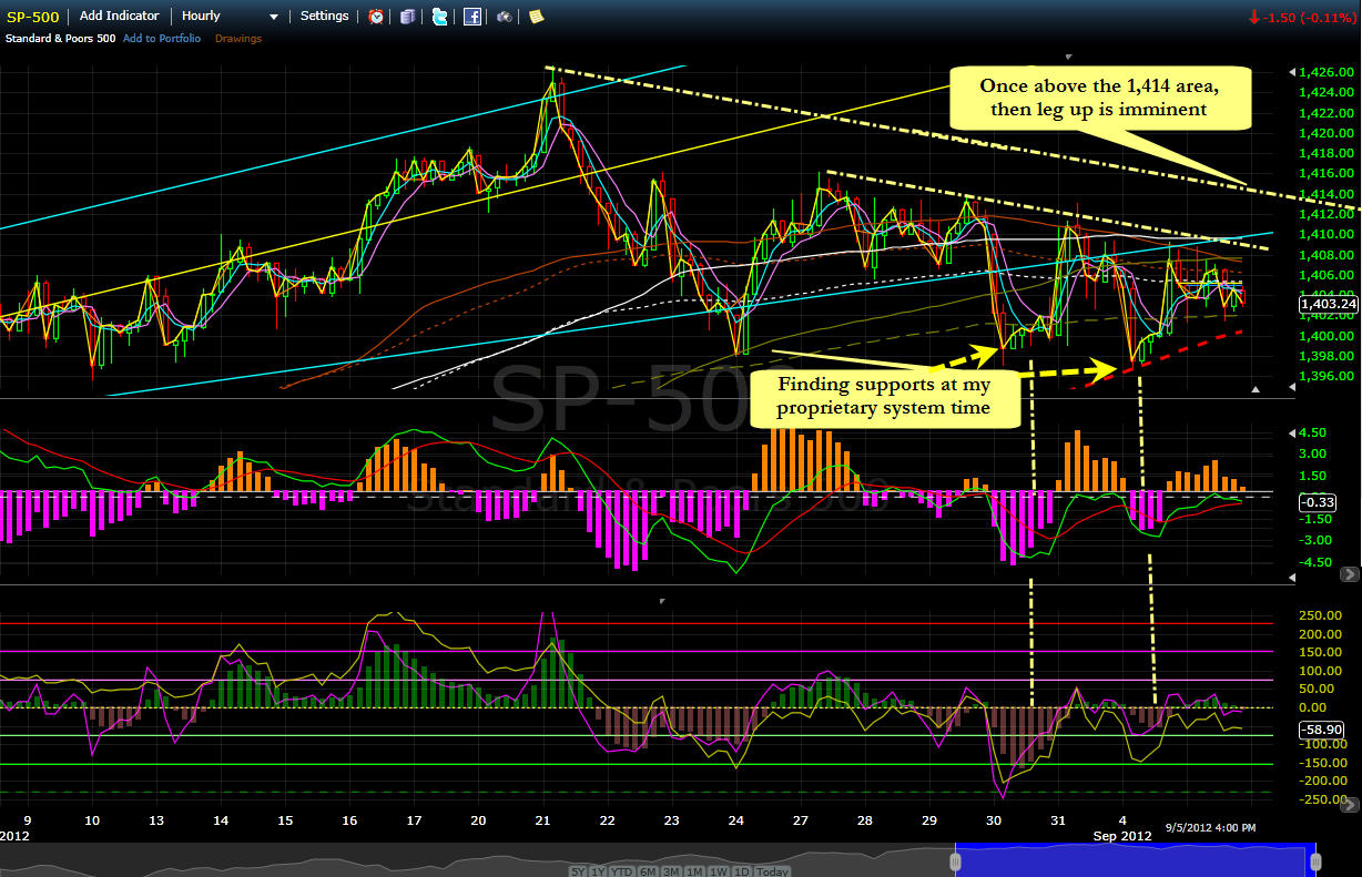 All indicators pointing to a jump up high over and above the consolidation area resistance. See attached hourly chart, that market has been finding supports at my proprietary system time cycle lines. Once the market jumps above, which shall be on 09/06//12 or 09/07/12, above the 1,414 area, then leg up is imminent.
