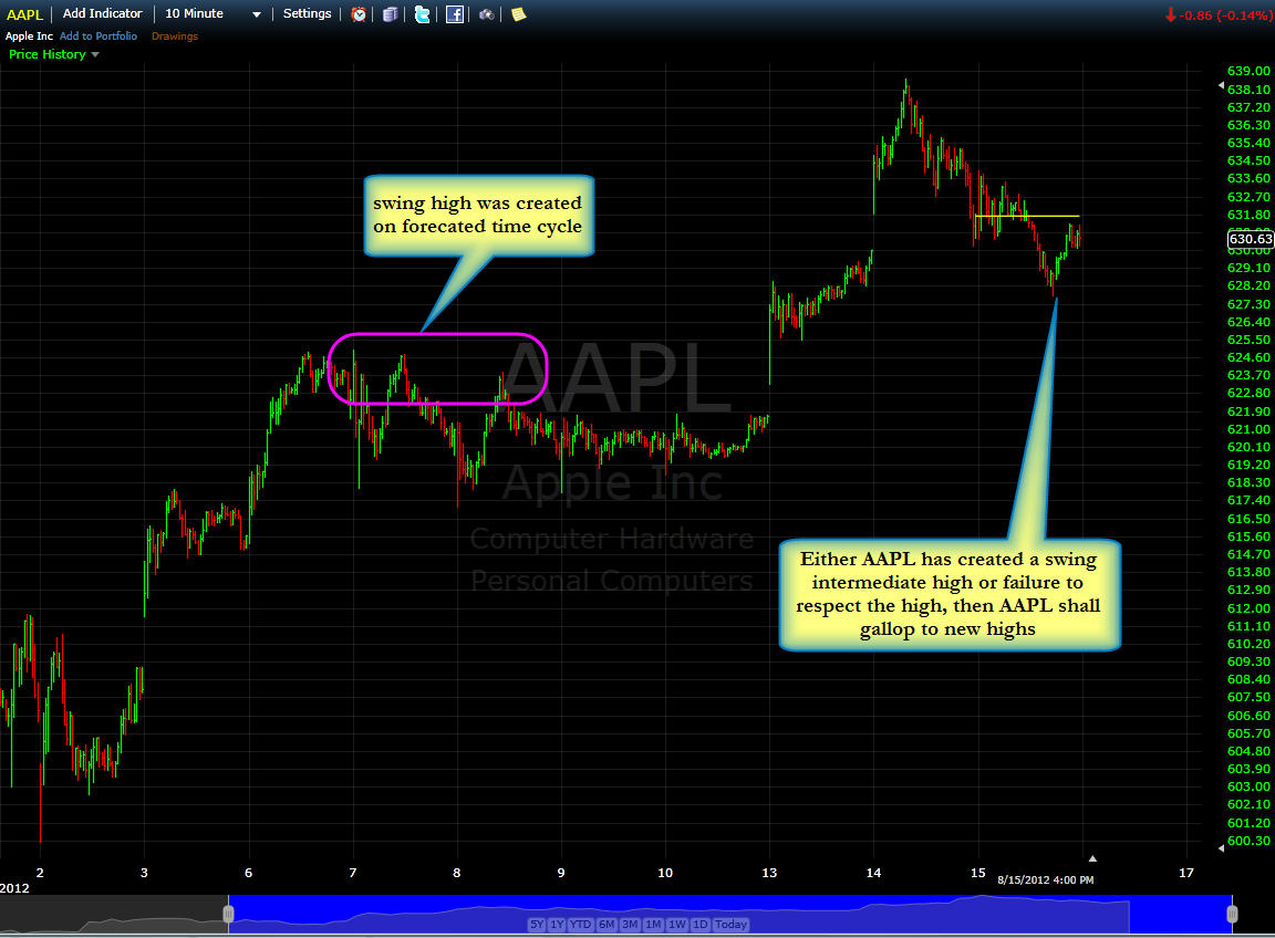 Now, AAPL has created a swing intermediate high or failure to respect the swing high, then AAPL shall gallop to new highs. If AAPL does not drop now, then, it shall rise to new highs. According to other rules of laws of vibration, when an expected move does not occur based upon the vibration, then the opposite move is expected, with much stronger force.