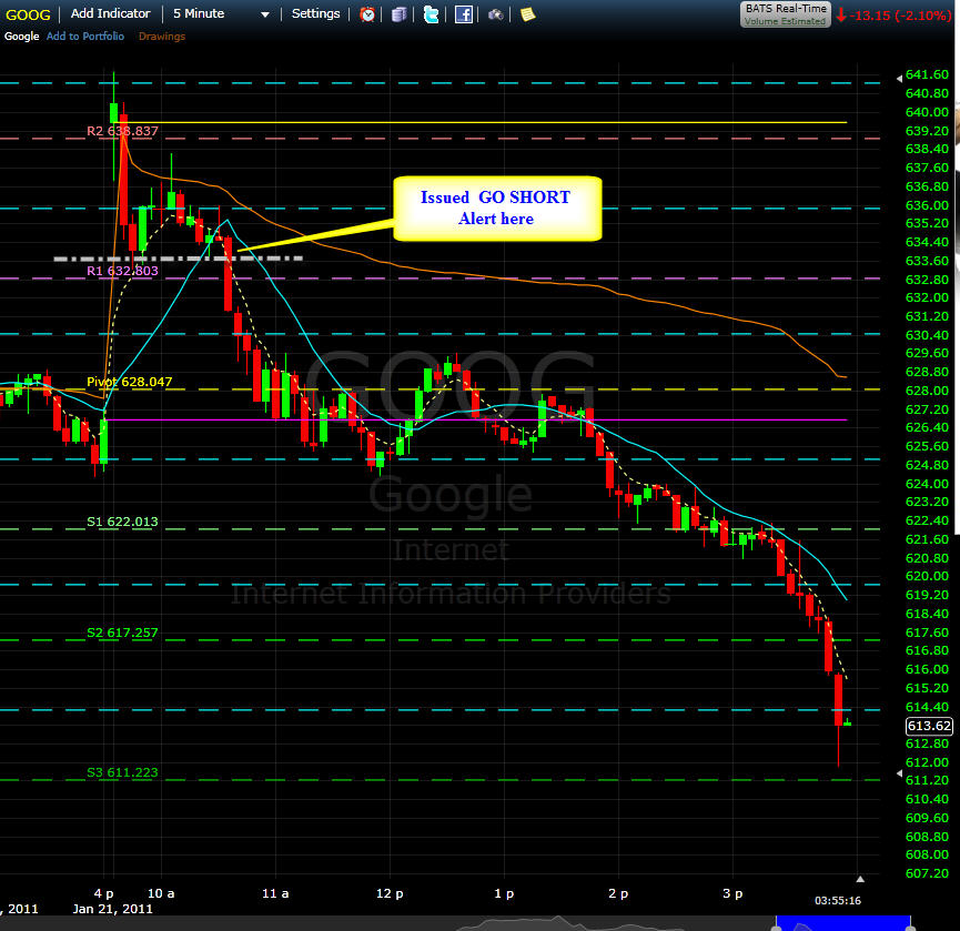 GOOG Forecast Update – ALERT Follow UpBy admin / January 21, 2011 With my gratitude to The Creator Closing GOOG day trade NOW. It dropped $22+ since I issued an alert! THE MOST ACCURATE FORECASTING OF FINANCIAL MARKETS http://trade-in-harmony.blogspot.com/
